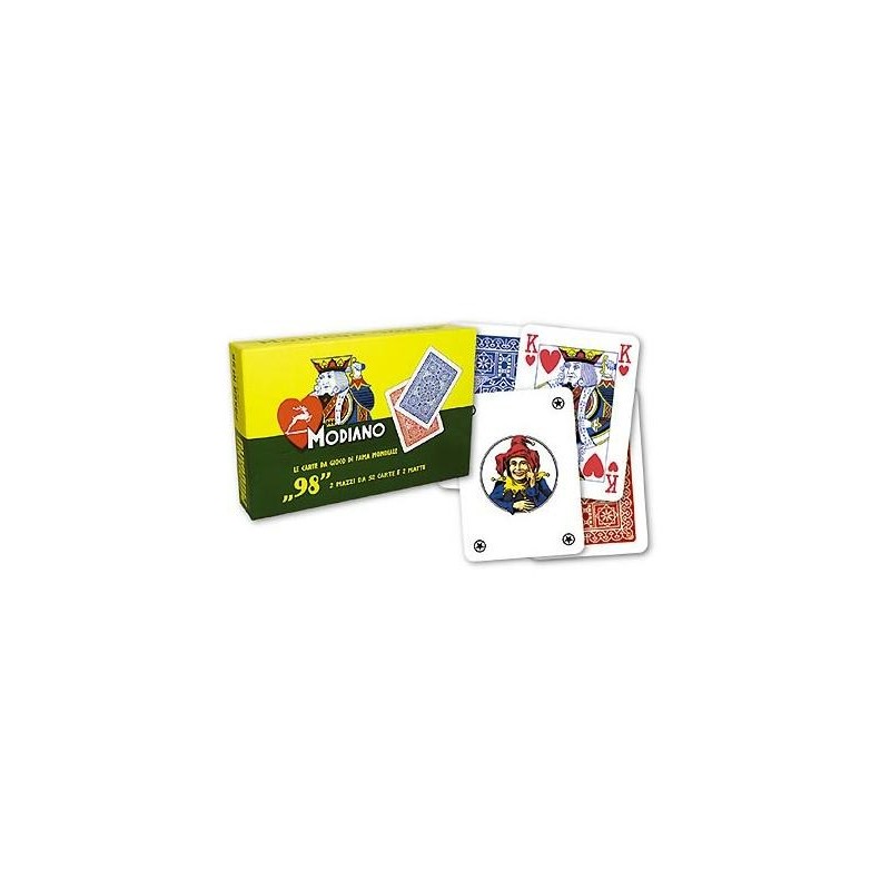 Le Modiano "98" sono un grande classico tra le carte da gioco. Costruite in cartoncino Duplex 350 gr plastificato misurano 63x88 mm. 108 Carte. Consigliata per l'utilizzo casalingo e comunque di buona fattura. Disegnato da Sigon negli anni ’50