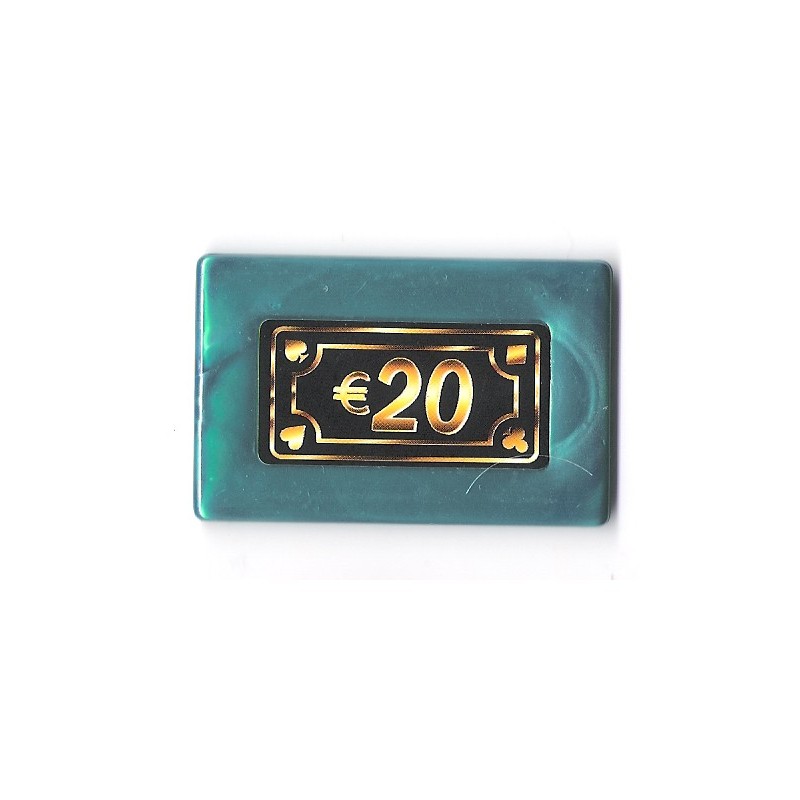 Chipsaus Perlmuttplastik mit Aufkleber für den Wert in Euro.