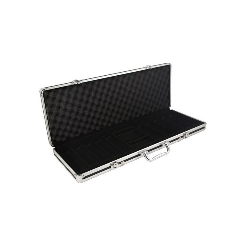 53 x 18 x 5 cm.. Capacity 500 chips diameter 39 mm. plus 2 decks of cards.