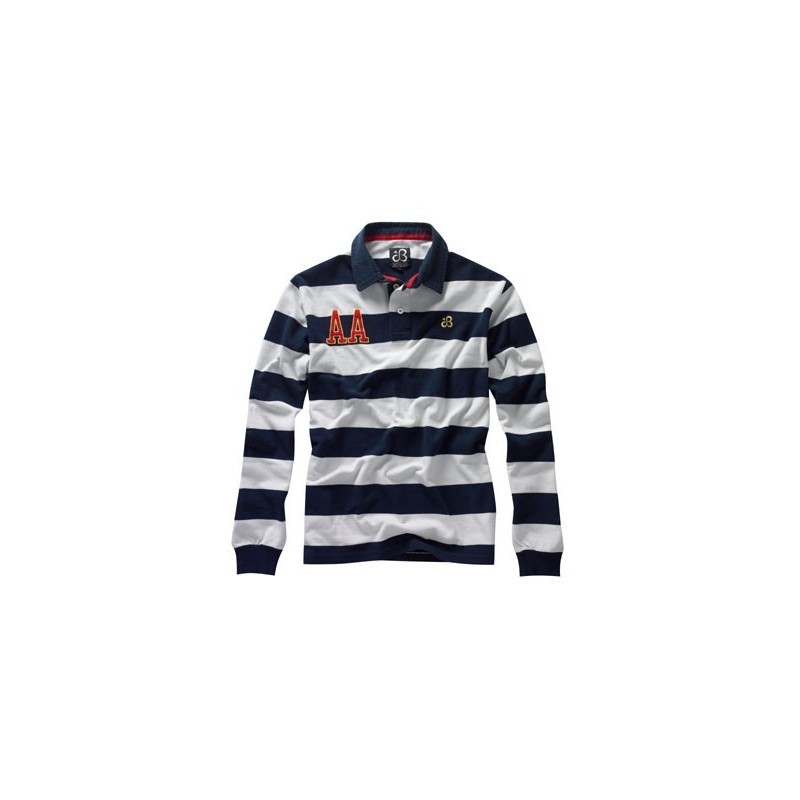 White and blue striped long sleeve polo shirt 100% cotton embroidered letters AA and Justbluff logo, red ribbon on the inside collar of the polo shirt